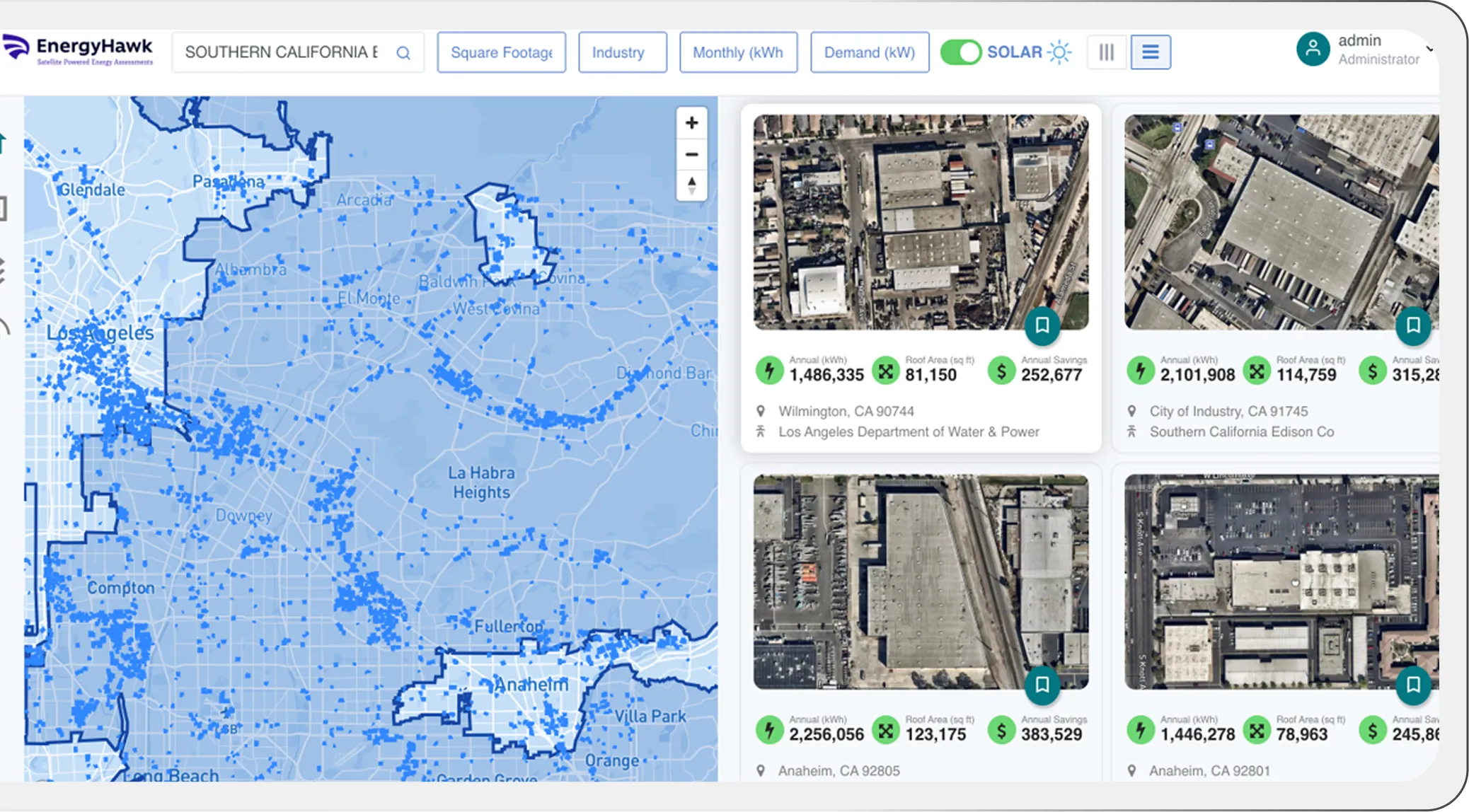 EnergyHawk allows Solar, Battery & other Energy sales teams to qualify and originate C&I facilities infinitely faster and with actionable insight. We do this by allowing users to search any Country, City, Utility and filter over 750,0000 buildings by kWh Usage, Demand (kW), Industry, Building (SQ. FT), Rooftop PV Capacity (kW), etc.